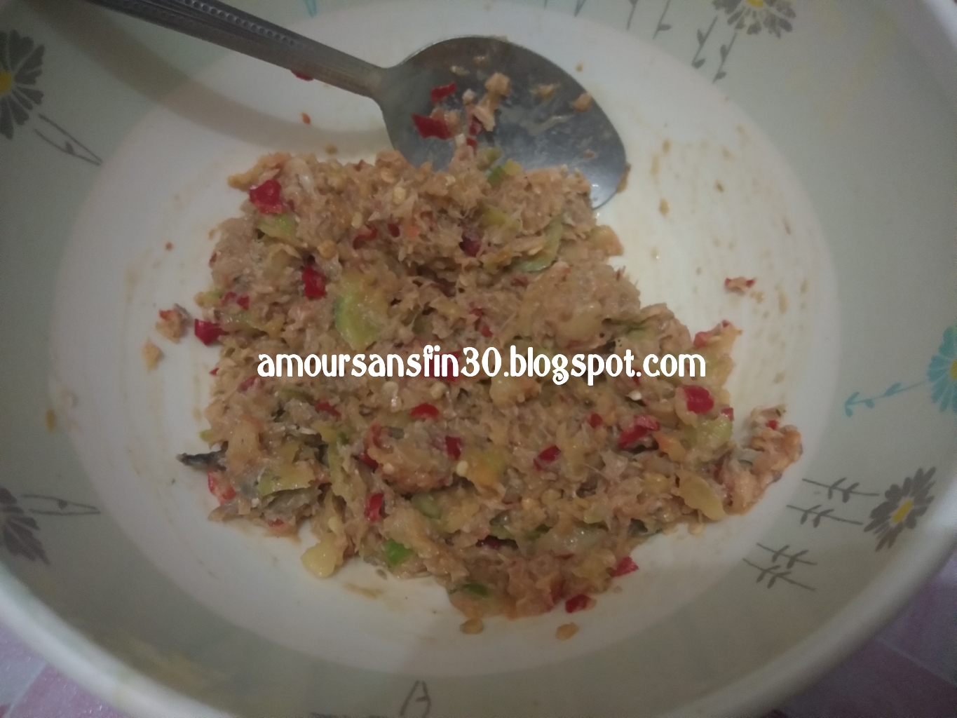 - Sumbat kesemua bahan yang dilenyek dan digaul sebati ke dalam tauhu yang dah berlubang tu.Sumbat bagi padat ya.Tak mau kedekut-kedekut okay.